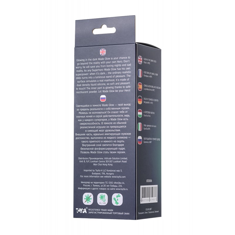 Светящийся в темноте Wade Glow — твой выход за пределы реальности с собственным героем. Можешь не волноваться! Он спасет тебя от скучных ночей и серой действительности, ведь, как у каждого супергероя, у Wade Glow есть сверхспособность. В темноте из обычной реалистичной игрушки он превращается в сияющий жезл удовольствия. Внешняя часть, идеально имитирующая мужское достоинство, выполнена из жидкого силикона — такого приятного и нежного на ощупь. Внутренний слой светится благодаря безопасной фосфоресцирующей пудре. Позволь Wade Glow стать твоим героем.