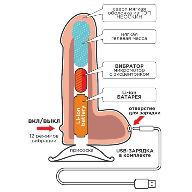 Реалистичный по форме, цвету и ощущениям, крепкий и упругий, достаточно толстый, с мошонкой и раскрытой головкой.Забавная игра плотного стимулятора, обладающего 12 режимами вибрации, способна удивить самых разбалованных дам, желающих познать все грани истинного удовольствия!Наличие присоски позволит закрепить вибратор так, как нравится Вам, полностью освободив руки - это позволит насладиться процессом в полной мере!Для более комфортного использования и сохранения качества материала рекомендуем использовать смазки только на водной основе.Размеры: общая длина 23 см, рабочая длина 16 см, максимальный диаметр 5 см, диаметр головки 4,5 см