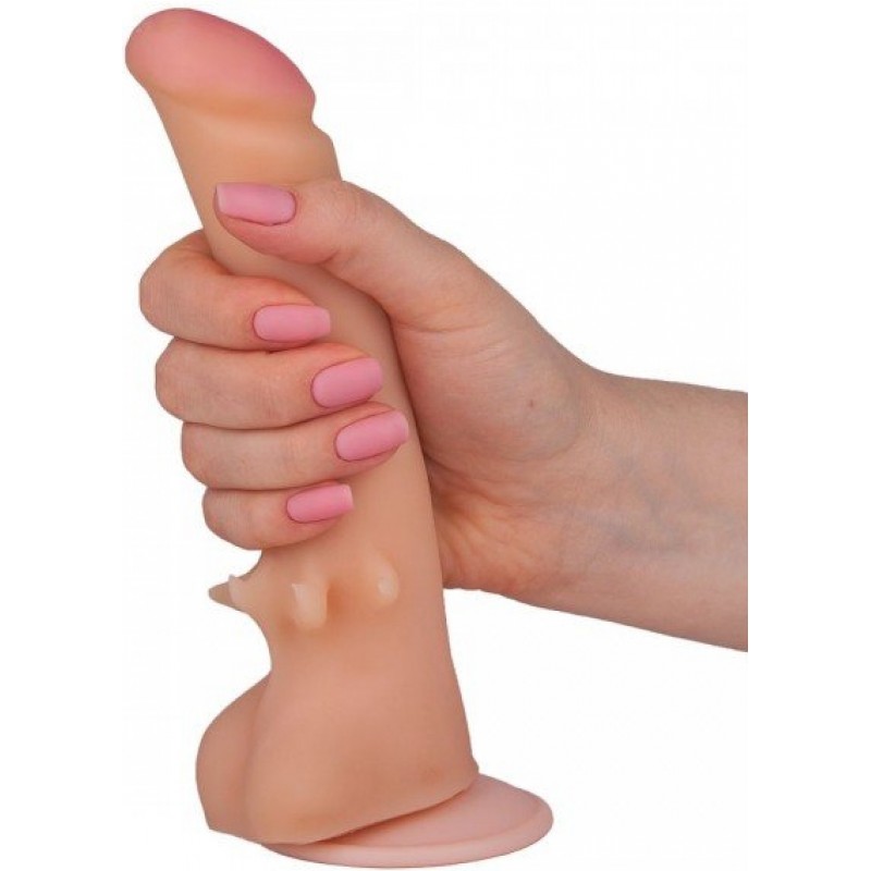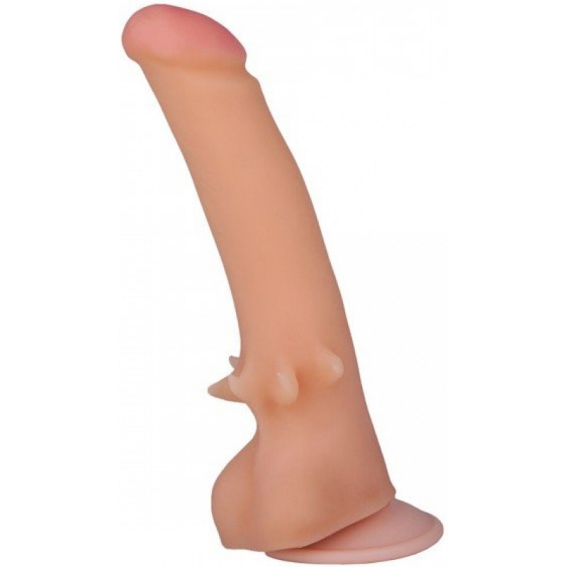 Увеличенная головка загнутой формы обеспечит интенсивную стимуляцию влагалища и точки G, а дополнительная стимуляция, расположенная чуть выше мошонки фаллоимитатора, добавит необычных ощущений во время фрикций. Благодаря мощной присоске, данную модель можно закрепить на любой плоской поверхности. Фаллоимитатор выполнен из безопасной и приятной на ощупь киберкожи, без содержания фталатов.