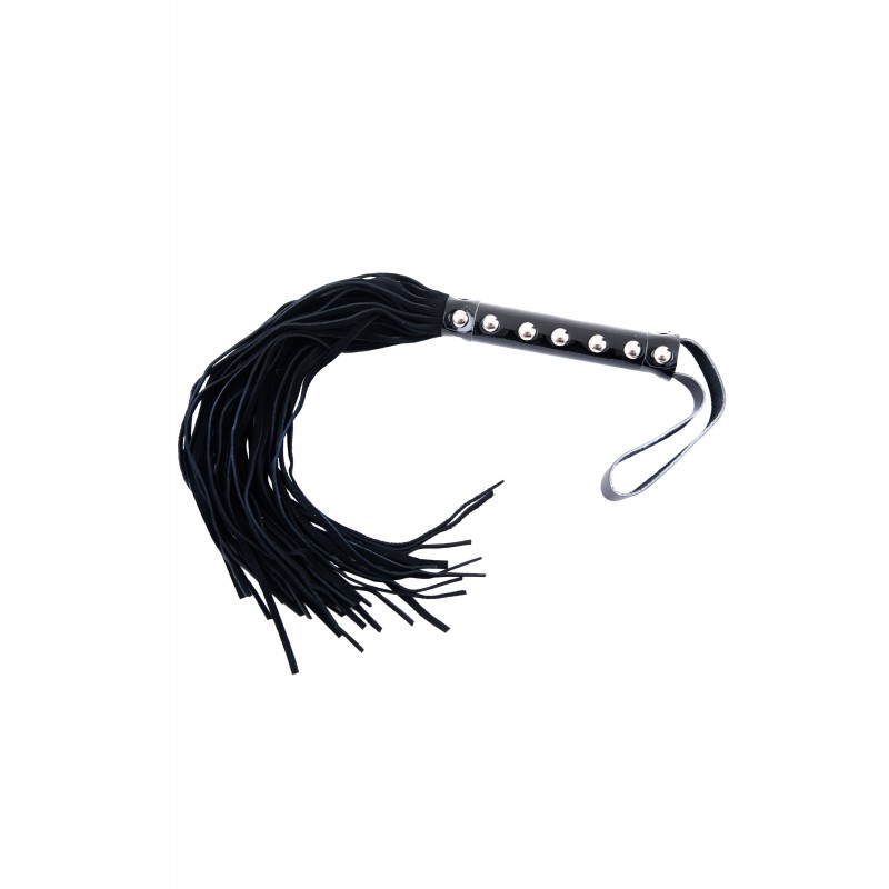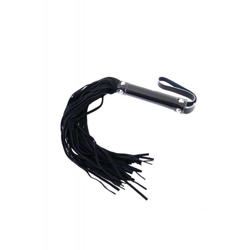 Флоггер с 40-а замшевыми хвостами и жёсткой ручкой, обтянутой лакированной кожей и декорированной блестящими заклёпками, выглядит угрожающе и невероятно стильно. Но внешняя привлекательность — не единственное преимущество этого аксессуара. Для удобства держания имеется кожаная петля, длина хвостов составляет 33 см, а длина ручки достигает 16 см. Такой экземпляр отлично подходит для разогрева и лёгких игр в наказание.