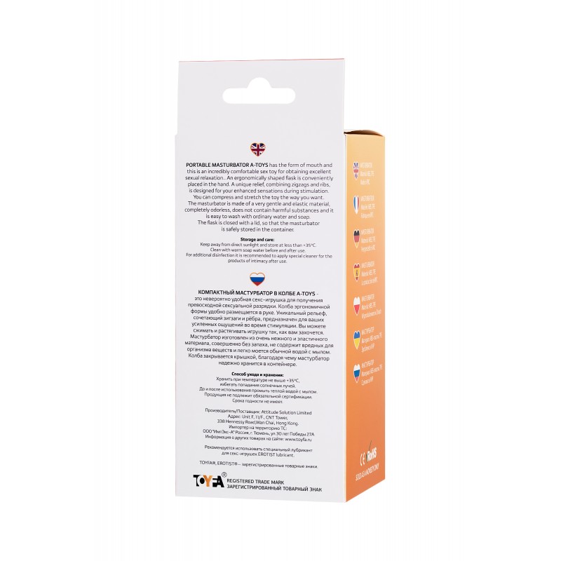 Компактный мастурбатор в колбе A-Toys имеет вид ротика с аппетитными губками, которые легко растягиваются до нужного размера. Колба эргономичной формы удобно размещается в руке. Уникальный рельеф, сочетающий зигзаги и рёбра, предназначен для ваших усиленных ощущений во время стимуляции. Вы можете сжимать и растягивать игрушку так, как вам захочется. Мастурбатор изготовлен из очень нежного и эластичного материала, совершенно без запаха, не содержит вредных для организма веществ и легко моется обычной водой с мылом. Колба закрывается крышкой, благодаря чему мастурбатор надежно хранится в контейнере.