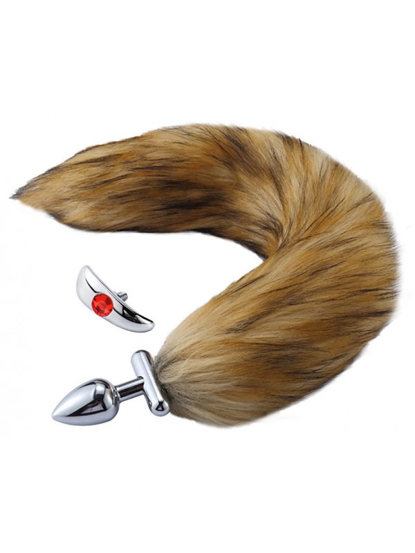 Металлическая анальная втулка со съемным рыжим хвостиком и пробкой с красным кристаллом код RY-130-S+MPJ-010-.777