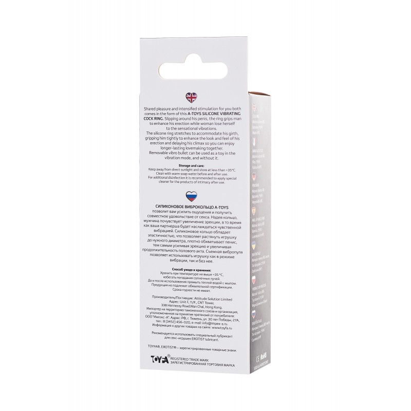 Силиконовое виброкольцо А-Toys позволит вам усилить ощущения и получить совместное удовольствие от секса. Надев кольцо, мужчина почувствует увеличение эрекции, в то время как ваша партнерша будет наслаждаться чувственной вибрацией. Силиконовое кольцо обладает эластичностью, что позволяет растянуть игрушку до нужного диаметра, плотно обхватывает пенис, тем самым усиливая эрекцию и увеличивая продолжительность полового акта. Съемная вибропуля позволяет использовать игрушку как в режиме вибрации, так и без нее. Общий размер кольца: 6,3 см Диаметр: 3,1 см