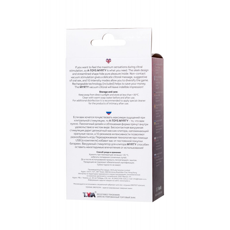 Эргономичный дизайн и соблазнительный ягодный цвет привнесут в интимную игру эстетическое наслаждение. А компактный размер, благодаря которому стимулятор легко поместится даже в косметичке, даст возможность не расставаться с этим удовольствием. MYRTY— ваша оргазмичная одиссея за экономичный бюджет.