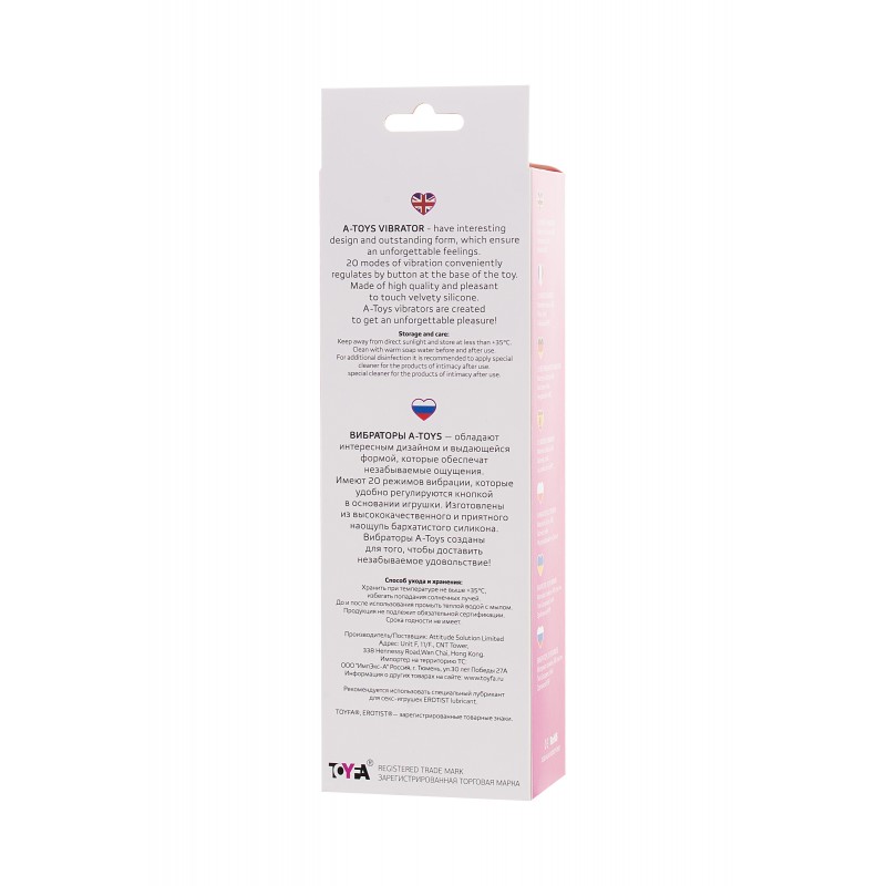 Вибраторы A-Toys — обладают интересным дизайном и выдающейся формой, которые обеспечат незабываемые ощущения. Имеют 20 режимов вибрации, которые удобно регулируются кнопкой в основании игрушки. Изготовлены из высококачественного и приятного наощупь, бархатистого силикона. Вибраторы A-Toys созданы для того, чтобы доставить незабываемое удовольствие!