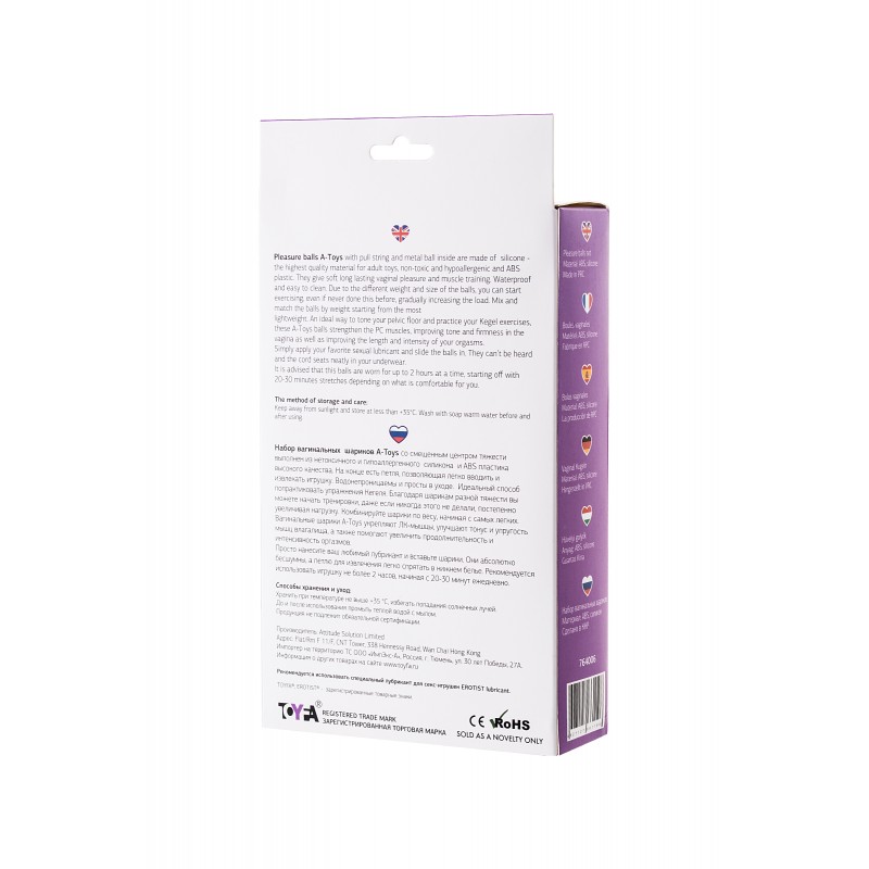 Благодаря шарикам разной тяжести вы можете начать тренировки, даже если никогда этого не делали, постепенно увеличивая нагрузку. Комбинируйте шарики по весу, начиная с самых легких. Вагинальные шарики А-Toys укрепляют мышцы, улучшают тонус и упругость мышц влагалища, а также помогают увеличить продолжительность и интенсивность оргазмов, благодаря чему Вы сможете нежно сжимать пенис мужчины, доставляя ему и себе незабываемое удовольствие.