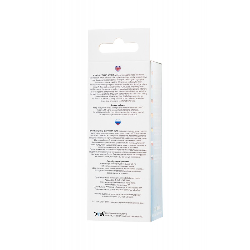 Вагинальные шарики A-Toys со смещенным центром тяжести выполнены из нетоксичного и гипоаллергенного 100% силикона высокого качества. На конце есть веревочка, позволяющая легко вводить и извлекать игрушку. Водонепроницаемы и просты в уходе. Идеальный способ попрактиковать упражнения Кегеля. Вагинальные шарики А-Toys укрепляют ЛК-мышцы, улучшают тонус и упругость мышц влагалища, а также помогают увеличить продолжительность и интенсивность оргазмов. Просто нанесите ваш любимый лубрикант и вставьте шарики один за другим. Они абсолютно бесшумны, а петлю для извлечения легко спрятать в нижнем белье. Рекомендуется использовать игрушку не более 2 часов, начиная с 20-30 минут ежедневно.