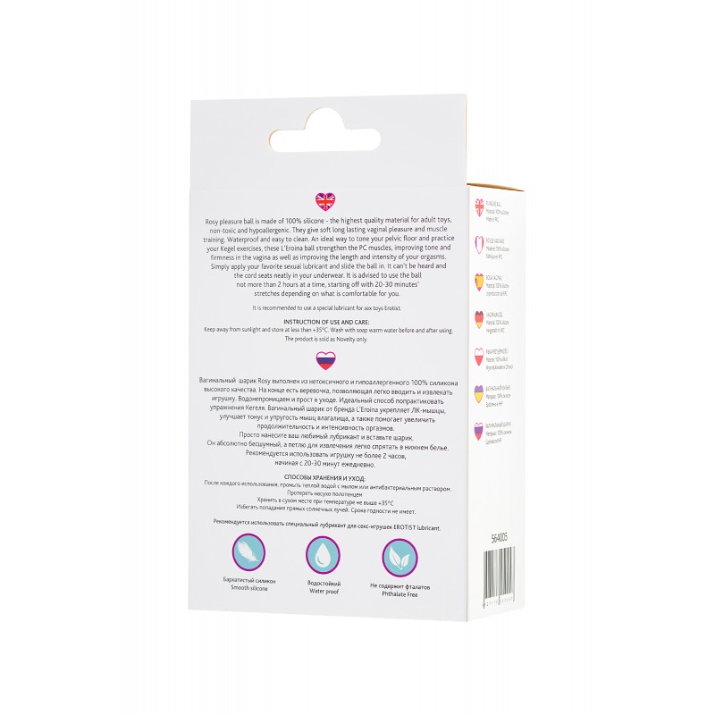 Вагинальный шарик Rosy выполнен из нетоксичного и гипоаллергенного 100% силикона высокого качества. На конце есть веревочка, позволяющая легко вводить и извлекать игрушку. Водонепроницаем и прост в уходе. Идеальный способ попрактиковать упражнения Кегеля. Вагинальный шарик от бренда L’Eroina укрепляет ЛК-мышцы, улучшает тонус и упругость мышц влагалища, а также помогает увеличить продолжительность и интенсивность оргазмов. Просто нанесите ваш любимый лубрикант и вставьте шарик. Он абсолютно бесшумный, а петлю для извлечения легко спрятать в нижнем белье. Общий длина: 10,5 см Диаметр: 3,1 см Вес: 50 гр.