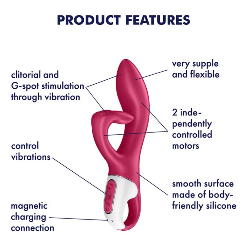 Изогнутая и объемная форма вагинального отростка балуют точку G, в то время как загнутый стимулятор клитора обеспечивает чувственную стимуляцию клитора и половых губ! Благодаря необычной форме клиторального стимулятора, Ваша жемчужина удовольствия стимулируется сверху, с одновременным захватом половых губ.За счёт толстого ствола и увеличенной головки создаётся приятное ощущение наполненности во влагалище, это касается и клиторального отростка — он достаточно объемный, поэтому действует не точечно, а полностью покрывает своей поверхностью клитор. Satisfyer Embrace Me представляет собой идеальное сочетание сильных моторов и высококачественного упругого медицинского силикона.