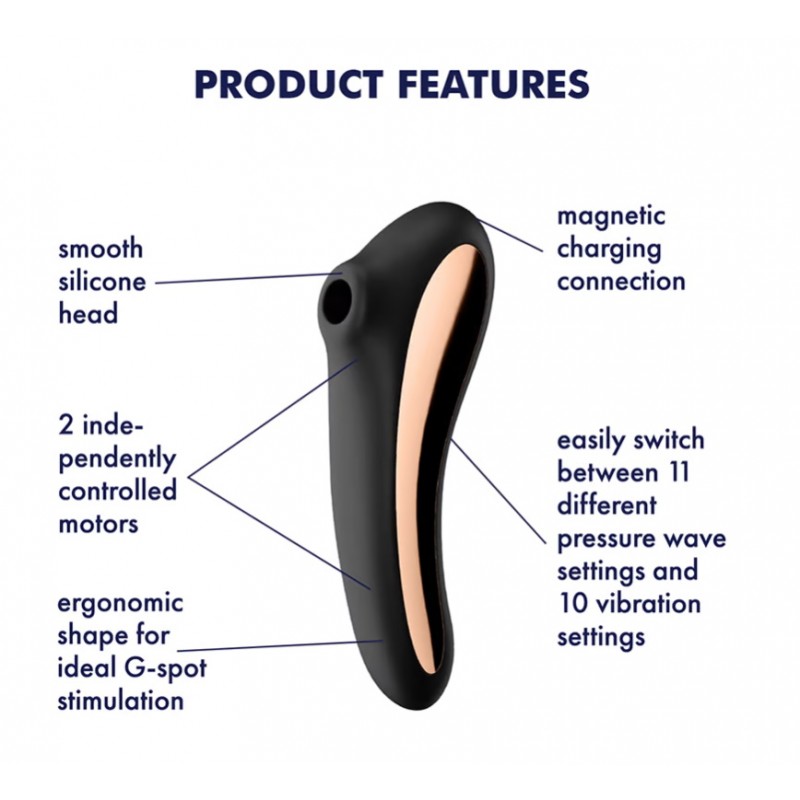 - 10 режимов вибрации: увеличенный размер насадки сделает процесс еще более возбуждающим и ярким, вы можете комбинировать вибрацию с вакуумным воздействием.В результате Вы имеете возможность индивидуально подобрать оптимальные для самоудовлетворения режимы вибрации и вакуумно-волновой стимуляции, которые подарят Вам незабываемый оргазм.Satisfyer Dual Kiss будет баловать Вас 110 комбинациями под любое настроение! Нет никакого сомнения, что многие из них превратят пользование стимулятором в самое яркое эротическое приключение.Среди других выгод и преимуществ данного гаджета можно выделить следующие:- Возможность использовать вибрацию наравне или вместо вакуума