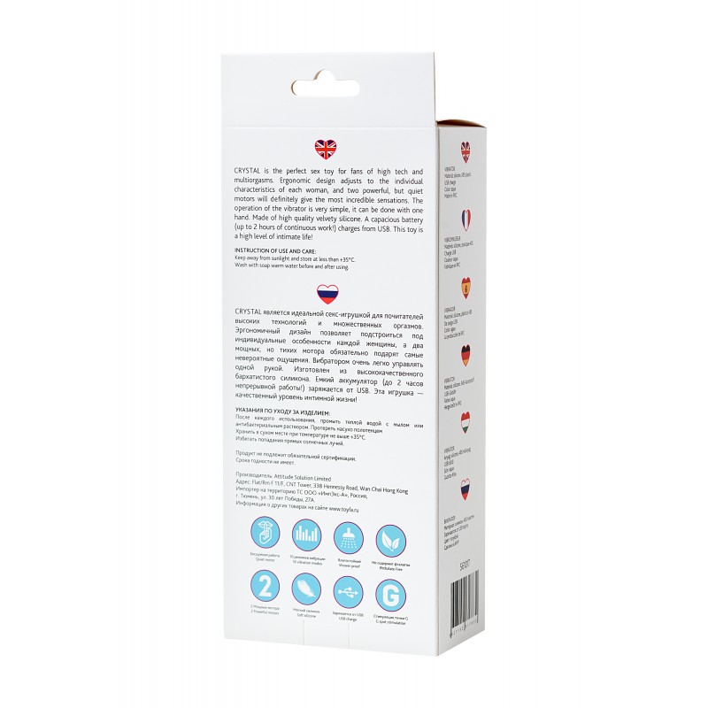 CRYSTAL является идеальной секс-игрушкой для почитателей высоких технологий и множественных оргазмов. Эргономичный дизайн позволяет подстроится под индивидуальные особенности каждой женщины, а два мощных, но тихих мотора обязательно подарят самые невероятные ощущения. Вибратором очень легко управлять одной рукой. Изготовлен из высококачественного бархатистого силикона. Емкий аккумулятор (до 2 часов непрерывной работы!) заряжается от USB. Эта игрушка — качественный уровень интимной жизни!
