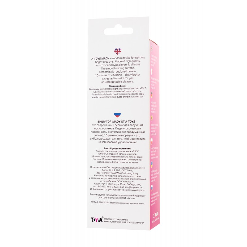 Вибратор Mady от A-Toys – это современный девайс для получения ярких оргазмов. Гладкая скользящая поверхность, анатомически продуманный рельеф, 10 режимов вибрации, влагостойкость – этот вибратор создан для того, чтобы доставить незабываемое удовольствие!