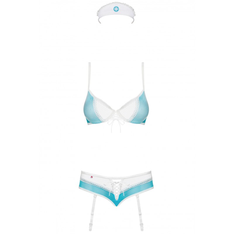 Готовы к обследованию? Пригласите пациента в спальню и попросите подготовиться к исключительно приятному визиту! Пришло время тщательных обследований и уникальных впечатлений. Детали: соблазнительный костюм озорной медсестры, бюстгальтер с чашечками на косточках - идеальная поддержка бюста, регулируемые бретели и трехступенчатая застежка - еще лучшая посадка, кокетливая шнуровка между чашками и на трусиках усиливает атмосферу, съемные бретели для чулок с регулируемой длиной, все это дополнительно украшено изящными атласными бантами - ведь важна каждая деталь, приятные на ощупь эластичные ткани.