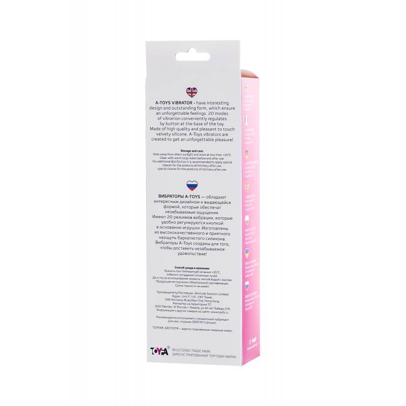 Вибраторы A-Toys — обладают интересным дизайном и выдающейся формой, которые обеспечат незабываемые ощущения. Имеют 20 режимов вибрации, которые удобно регулируются кнопкой в основании игрушки. Изготовлены из высококачественного и приятного наощупь, бархатистого силикона. Вибраторы A-Toys созданы для того, чтобы доставить незабываемое удовольствие!