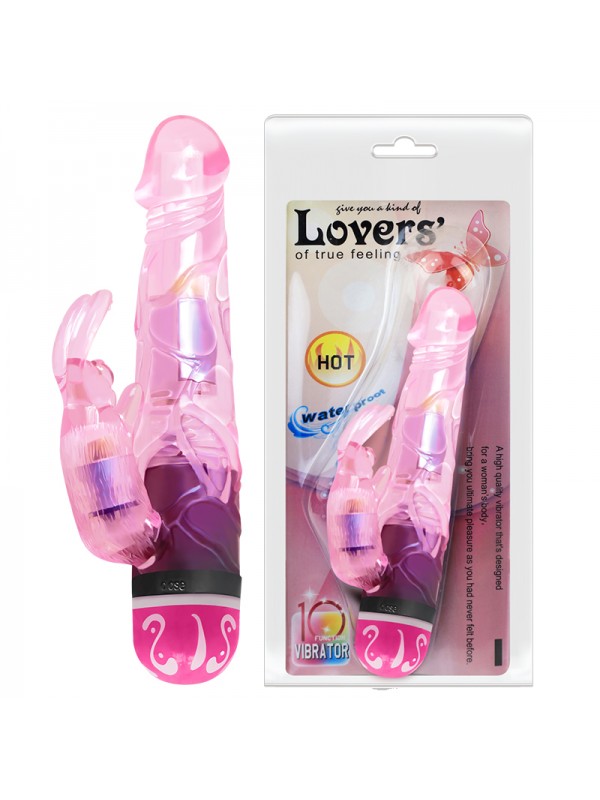 Яркий и необычный вибратор с клиторальным стимулятором-зайчиком не оставит Вас равнодушными - стоит только попробовать!Lovers имеет ярко выраженную головку, имитирующую головку мужского члена с небольшими складочками крайней плоти - такая форма отлично подходит для интенсивной стимуляции точки G.