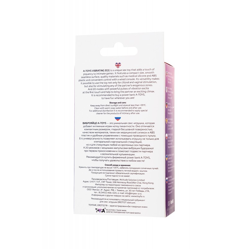 Виброяйцо A-Toys — это уникальная секс-игрушка, которая добавит интимным играм нотку пикантности. Оно отличается компактным размером, гладкой бесшовной поверхностью, качеством материалов, таких как медицинский силикон и ABS пластик и удобным управлением с помощью проводного пульта. Его универсальность позволяет использовать игрушку не только для клиторальной и вагинальной стимуляций, но и для стимуляции любой из эрогенных зон партнера. А 20 режимов с мощными импульсами вибрации будоражат при первом прикосновении и помогают подвести партнера к волнительной кульминации. Рекомендуется купить фирменный power bank TOYFA, чтобы получать удовольствие в любом месте!