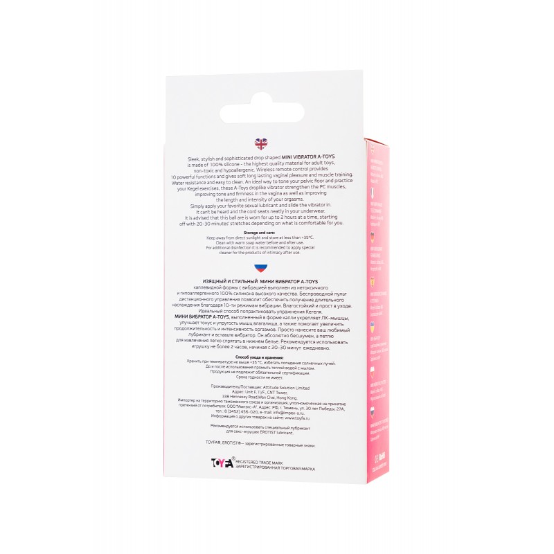 Изящный и стильный мини вибратор A-Toys каплевидной формы с вибрацией выполнен из нетоксичного и гипоаллергенного 100% силикона высокого качества. Беспроводной пульт дистанционного управления позволит обеспечить получение длительного наслаждения благодаря 10-ти режимам вибрации. Водонепроницаем и прост в уходе. Идеальный способ попрактиковать упражнения Кегеля. Мини вибратор А-Toys, выполненный в форме капли укрепляет ЛК-мышцы, улучшает тонус и упругость мышц влагалища, а также помогает увеличить продолжительность и интенсивность оргазмов. Просто нанесите ваш любимый лубрикант и вставьте вибратор. Он абсолютно бесшумен, а петлю для извлечения легко спрятать в нижнем белье. Рекомендуется использовать игрушку не более 2 часов, начиная с 20-30 минут ежедневно.