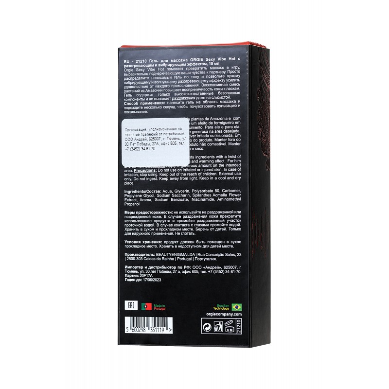 Гель для массажа ORGIE Sexy Vibe Hot с разогревающим и вибрирующим эффектом, 15 мл код 21210