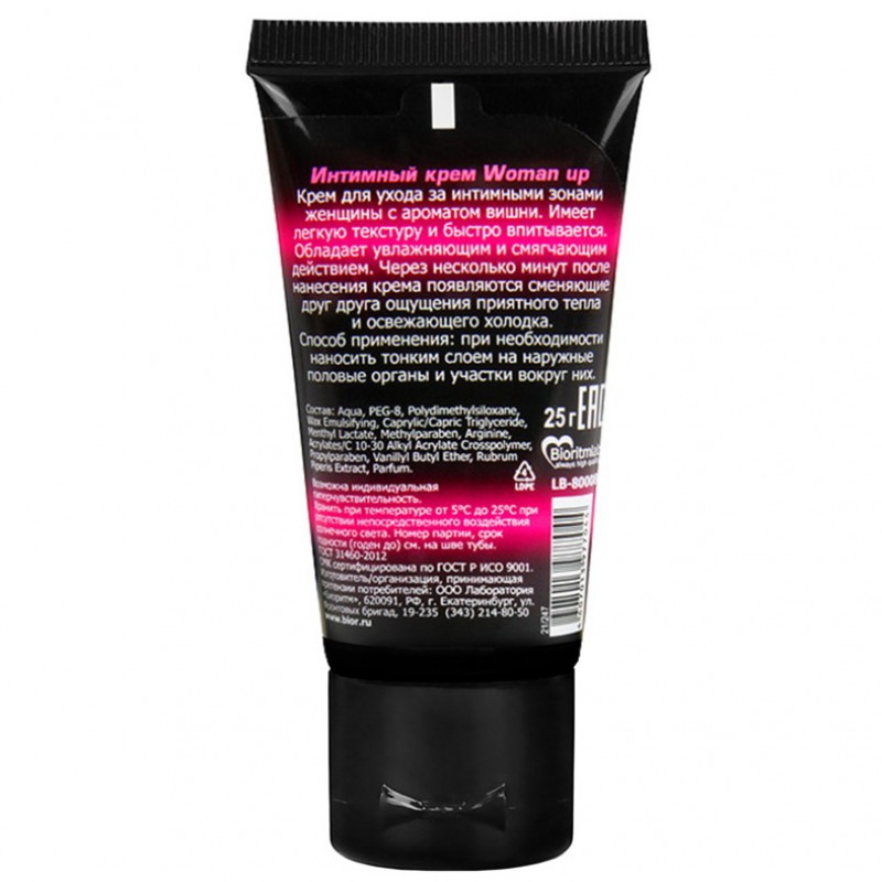 Лед и пламя… На что ты решишься, чтобы испытать новые сексуальные ощущения? Попробуй стимулирующий крем WOMAN UP с потрясающим ароматом вишни. С этим кремом ты можешь позволить себе пробудить дикую страсть и первобытные желания.Вмассируй небольшое количество крема в головку клитора во время прелюдии. Через пару минут ты ощутишь приятное тепло, разливающееся по всей чувствительной зоне, а затем морозную свежесть, как поцелуй ледяного ветра, а затем снова пекущее тепло. Этот невероятный танец между двух стихий поможет тебе достичь оргазма потрясающей силы. Сменяющие друг друга ощущения пробуждают чувственность и страсть как в соло игре, так и в занятии любовью с партнером. Увлажняющий и смягчающий крем WOMAN UP даст огня твоему телу и пробудит свою внутреннюю Богиню.Способ применения: перед интимной близостью нанести небольшое количество крема на клитор. Дозировка подбирается индивидуально, начиная с 1 капли размером с маленькую горошину. При необходимости количество стимулятора можно увеличивать. Возможна индивидуальная гиперчувствительность. Не допускать попадания в глаза, на раздраженную или поврежденную кожу.Объем: 25 гр