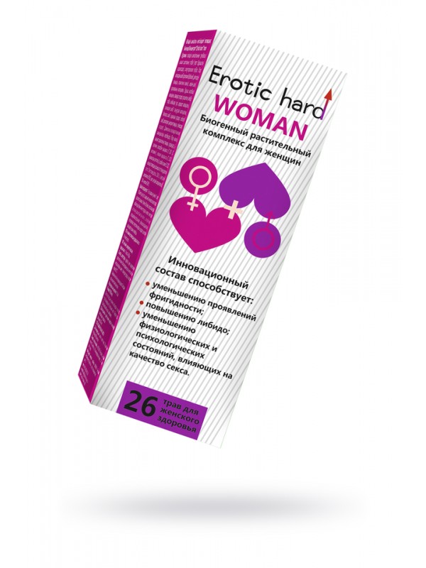 Концентрат «Erotic hard» WOMAN (растительное происхождение) показан женщинам для повышения либидо, сексуальности, а также профилактики воспалительных и инфекционных заболеваний мочеполовой системы, поддержания репродуктивной системы в норме, профилактики симптомов ПМС и климакса, улучшения настроения и уменьшению депрессивных состояний. Для этого достаточно его принимать внутрь в первой половине дня 1-2 столовые ложки (15-30 мл.), курс приема -21 день. Для достижения возбуждения и сексуальной активности (достижение которой происходит за счет увеличения кровообращения в области органов малого таза, половые органы и грудь становятся крайне чувствительными, набухшими, прикосновения к ним вызывают повышенную реакцию) перед половым актом 3-4 столовые ложки (45-60 мл.) за 1 час до полового акта.